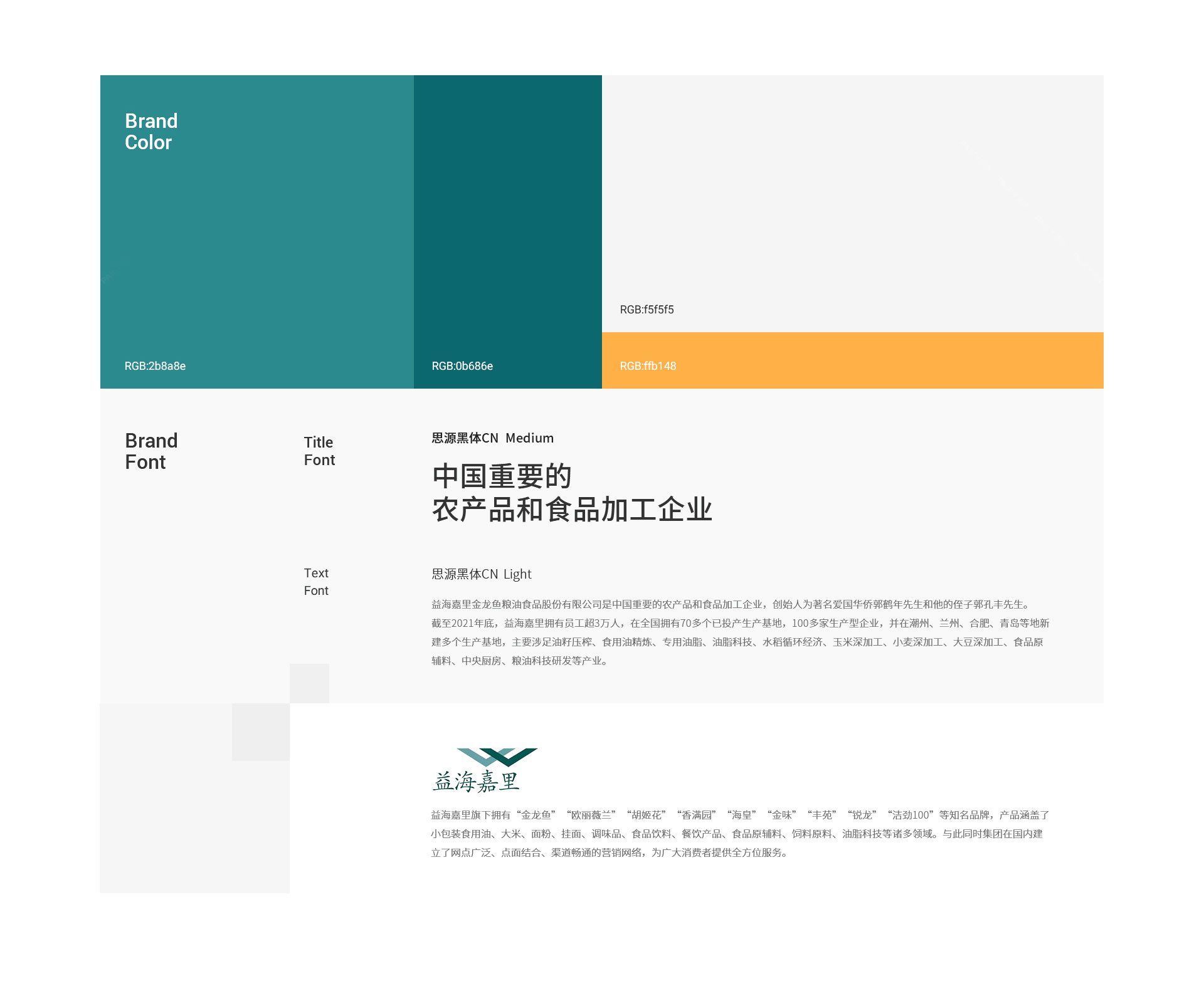 益海嘉裏旗下擁有“金龍魚”“歐麗薇蘭”“胡姬花”“香滿園”“海皇”“金味”“豐苑”“銳龍”“潔勁100”等知名品牌,產品涵蓋了小包裝食用油、大米、麵粉、掛麵、調味品、食品飲料、餐飲產品、食品原輔料、飼料原料、油脂科技等諸多領域。