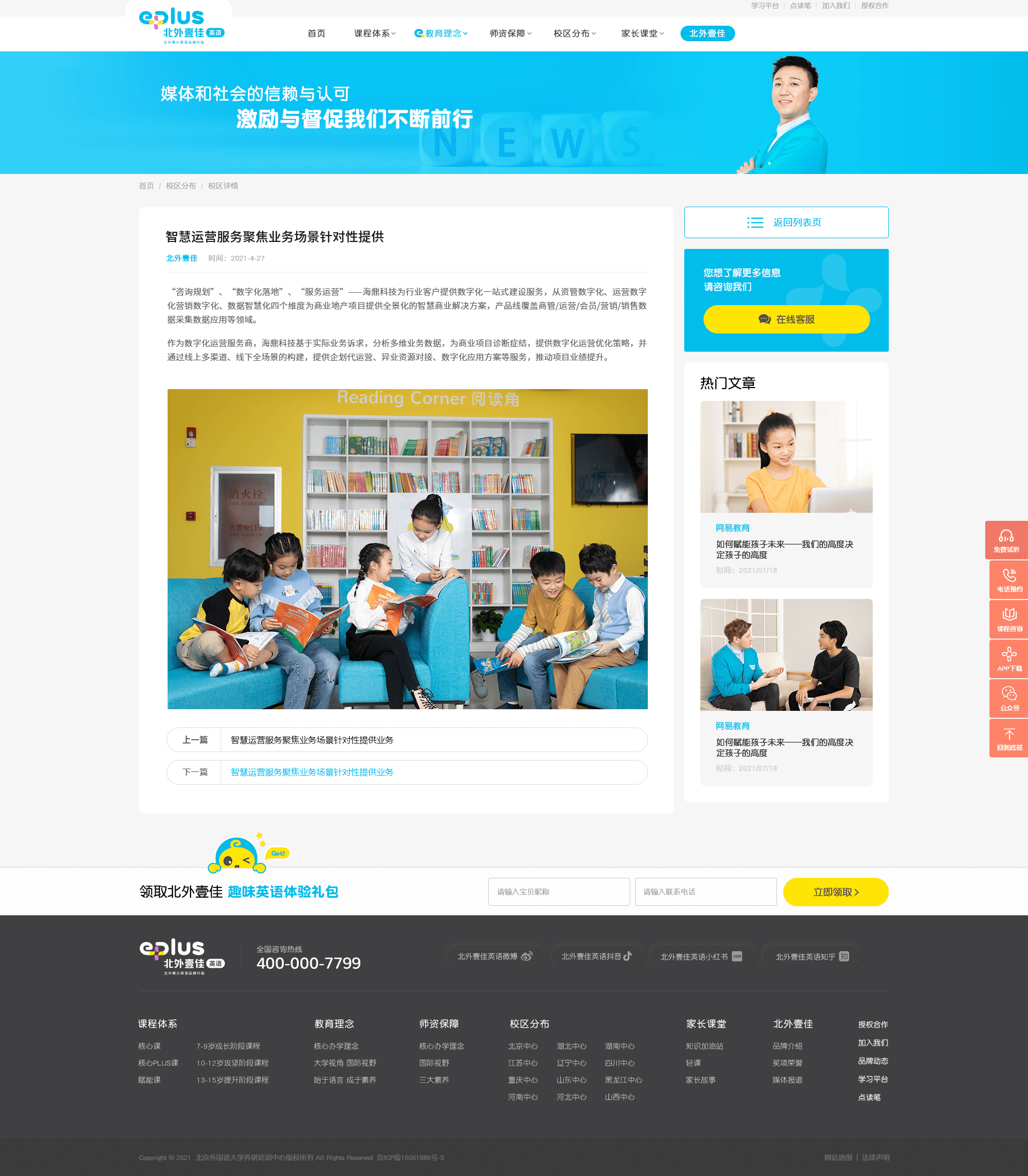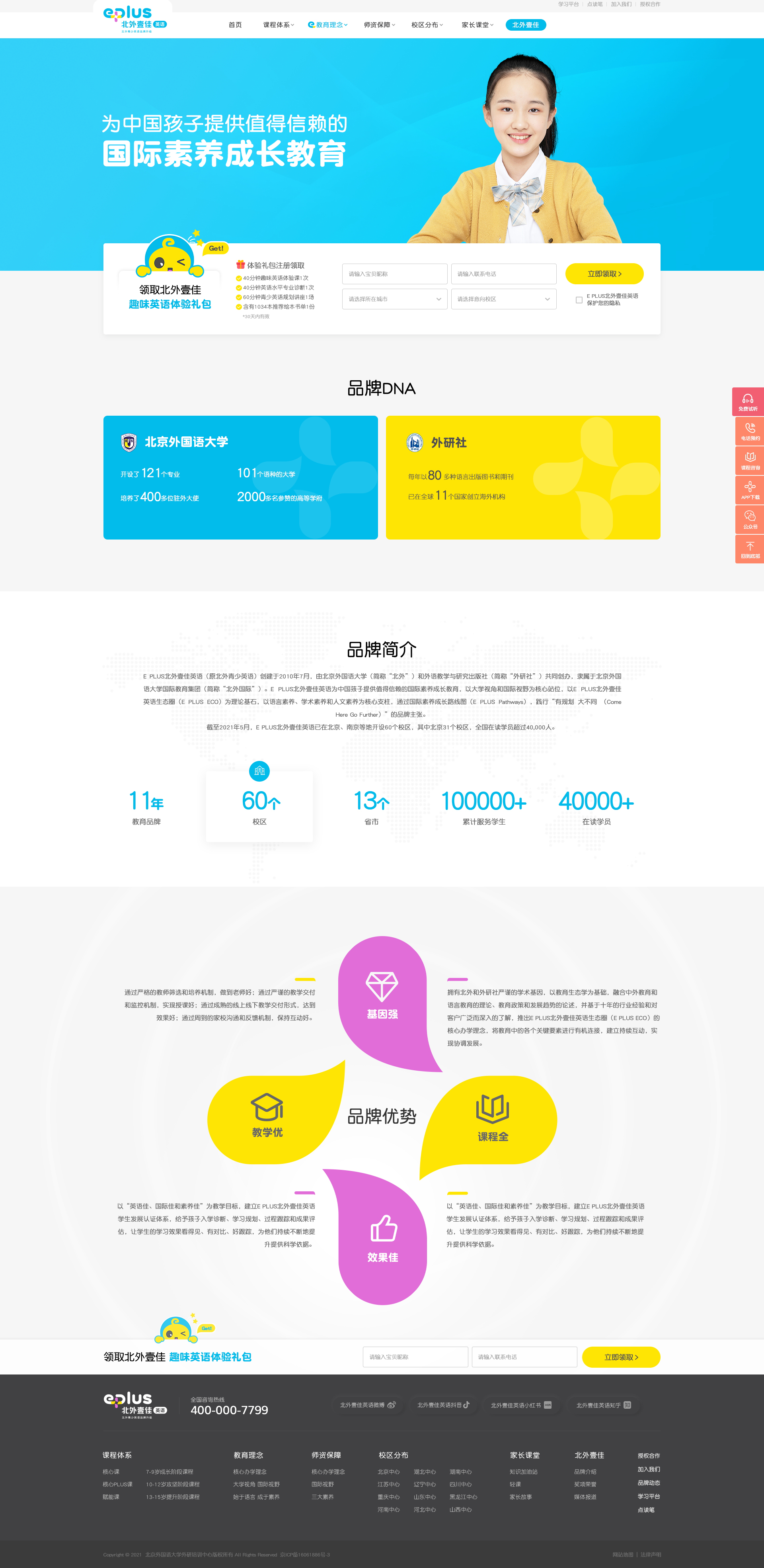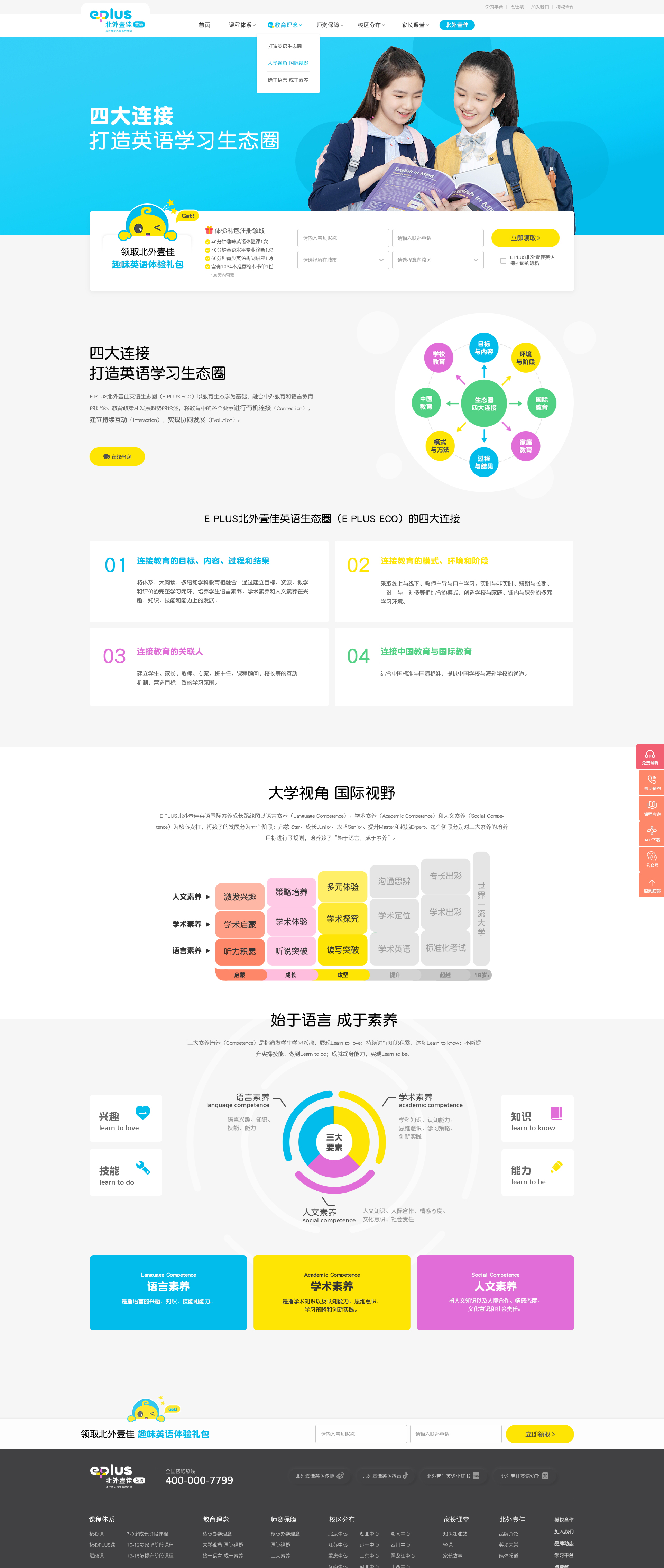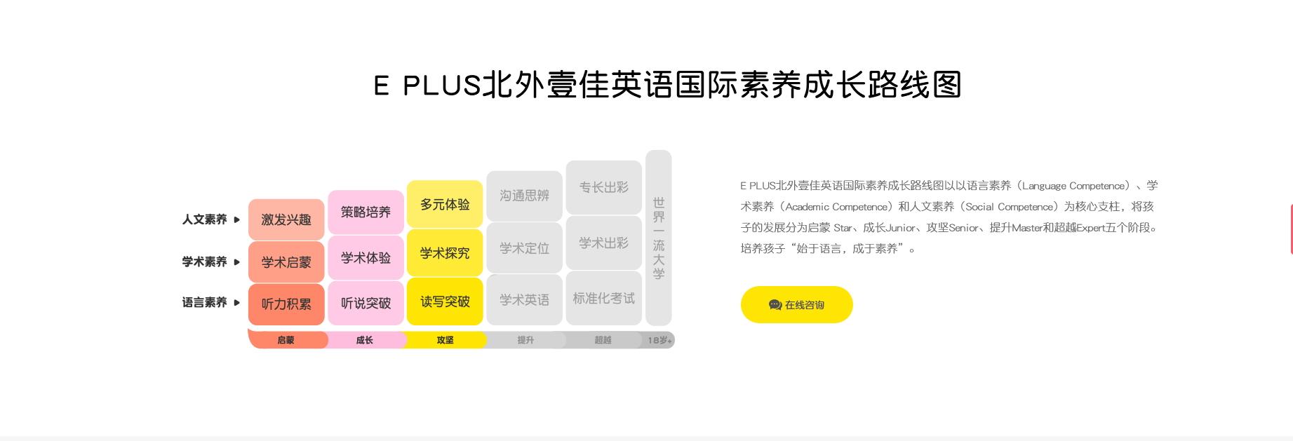 官網主色調采用淺藍色,象征著深邃與廣闊,寓意著北外壹佳在教育領域的深厚底蘊和無限可能。輔以黑色、白色和淡粉色,形成了鮮明而和諧的視覺效果。這樣的色彩搭配不僅提升了官網的整體美感,也凸顯了北外壹佳作為國際素養教育領航者的專業與專注。