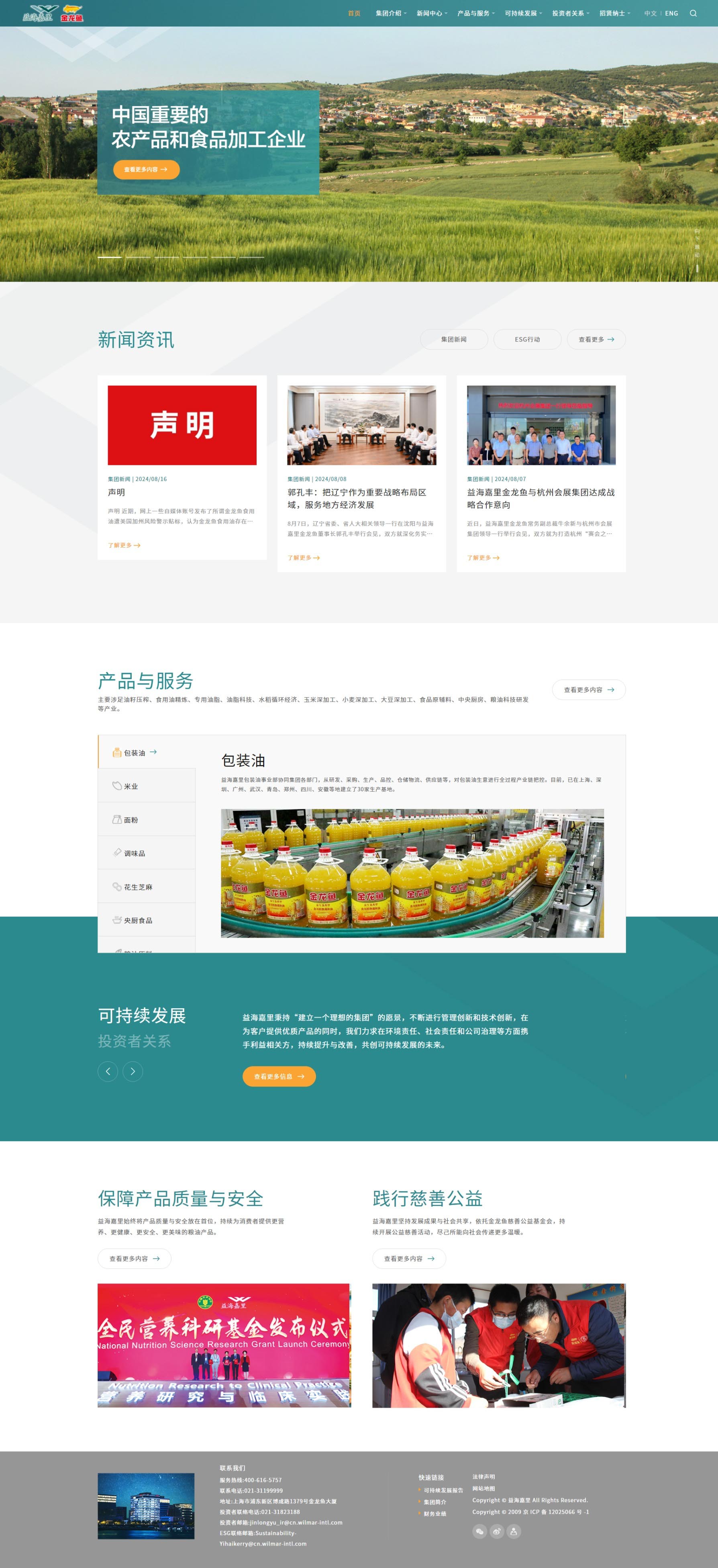 益海嘉裏網站設計獨特,以活力深綠為主色,輔以經典黑白,特色墨綠點綴其間。深綠彰顯企業活力與溫暖,黑白平衡視覺,提升內容可讀性;墨綠則傳遞自然、健康與環保理念。色彩搭配和諧統一,既展現了企業的年輕態與創新精神,又突出了對品質與可持續發展的承諾。