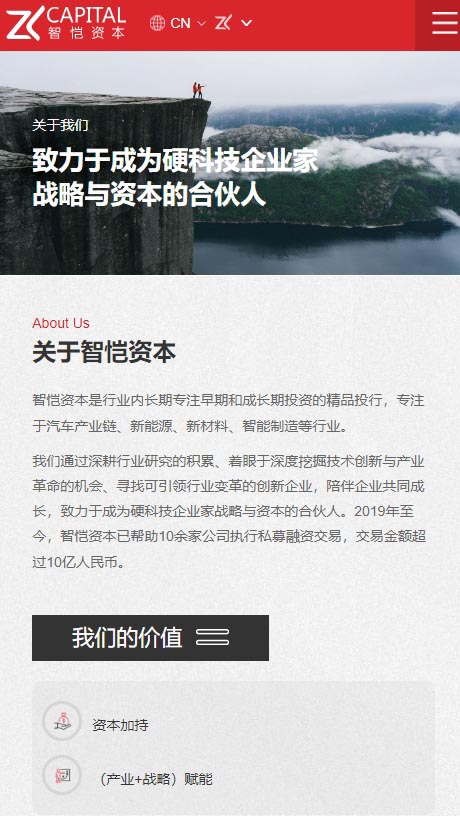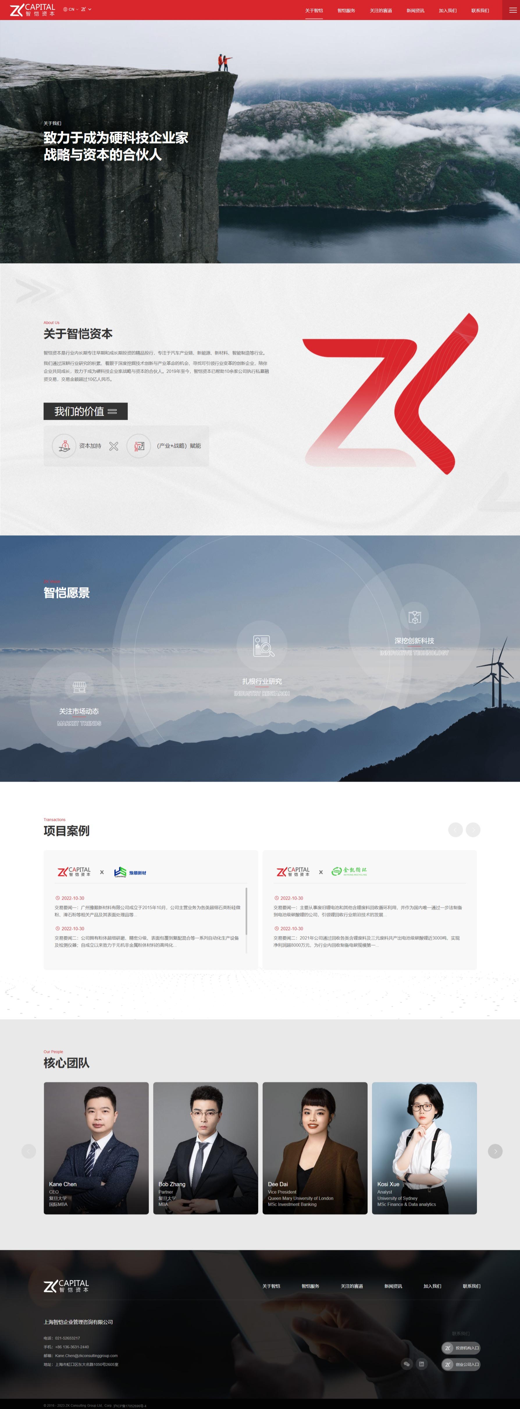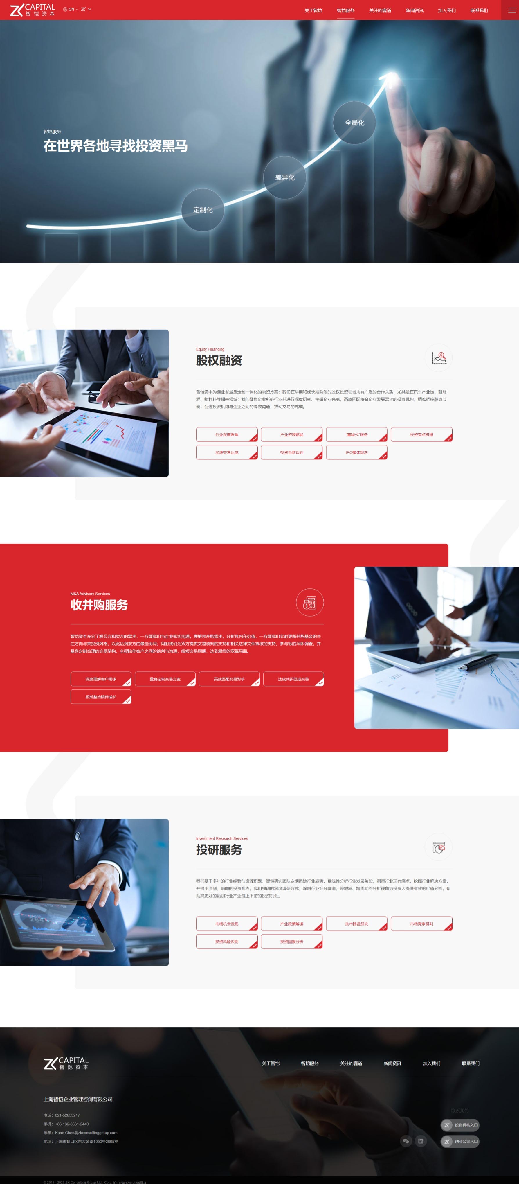 智愷資本官網設計獨具匠心,以紅色為主打,輔以灰、白、黑三色,既彰顯企業活力與創新,又不失穩重與專業。紅色主調引人注目,凸顯品牌熱情與前瞻;輔色則平衡視覺,營造現代簡潔感。官網布局清晰,導航便捷,用戶能迅速獲取所需信息。