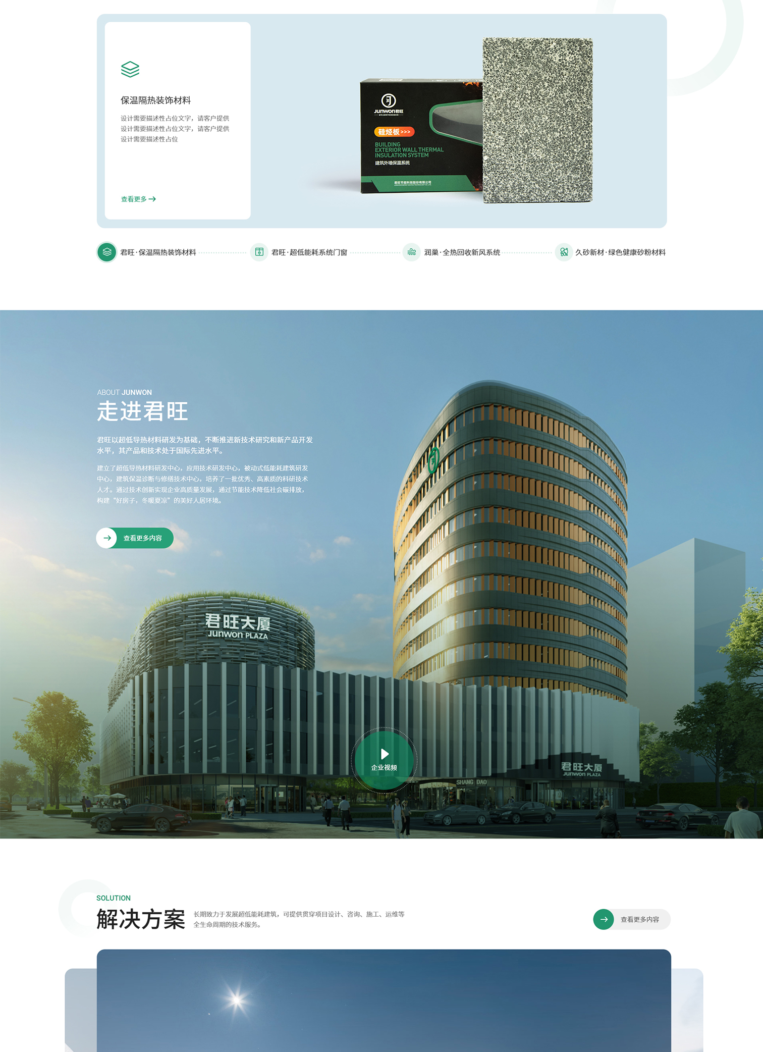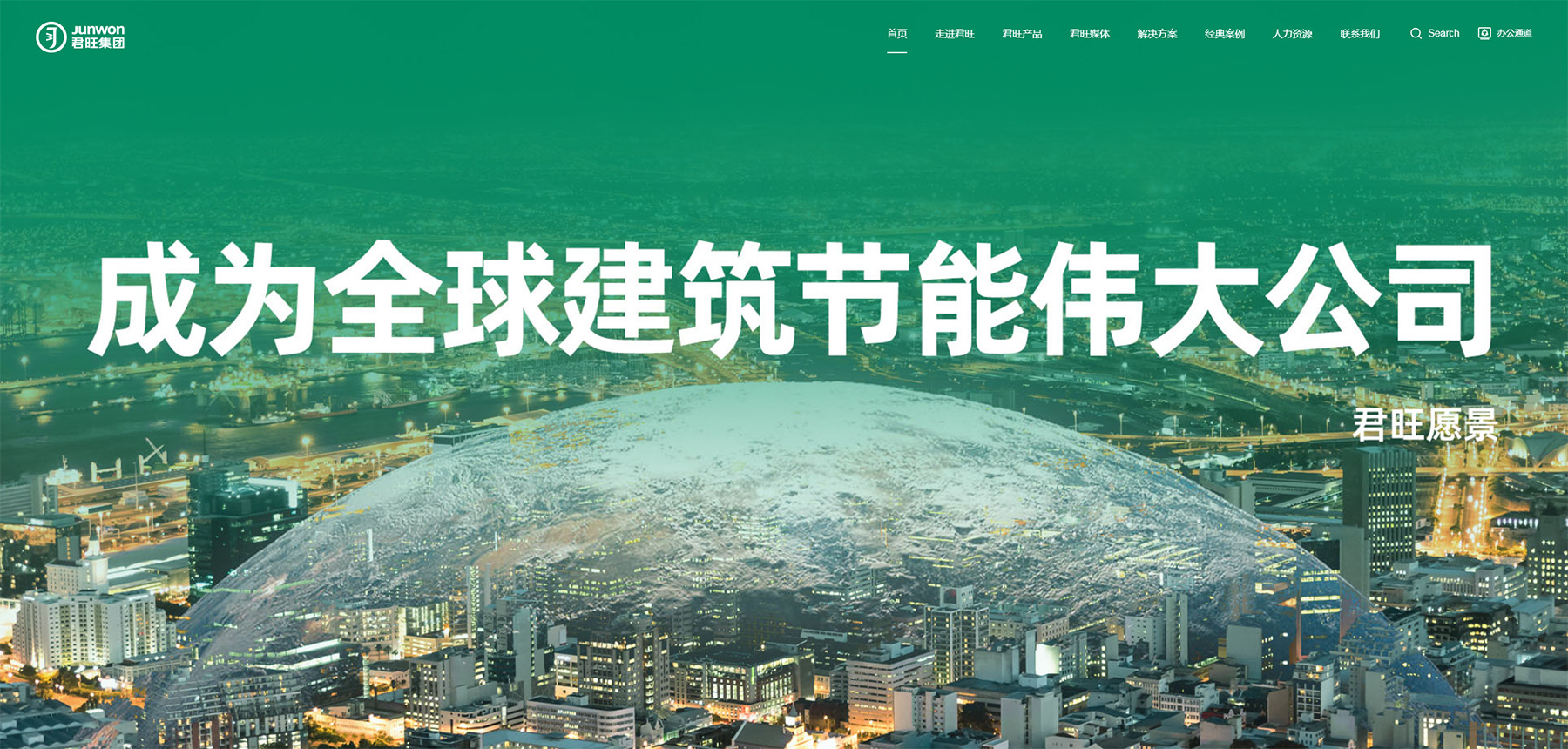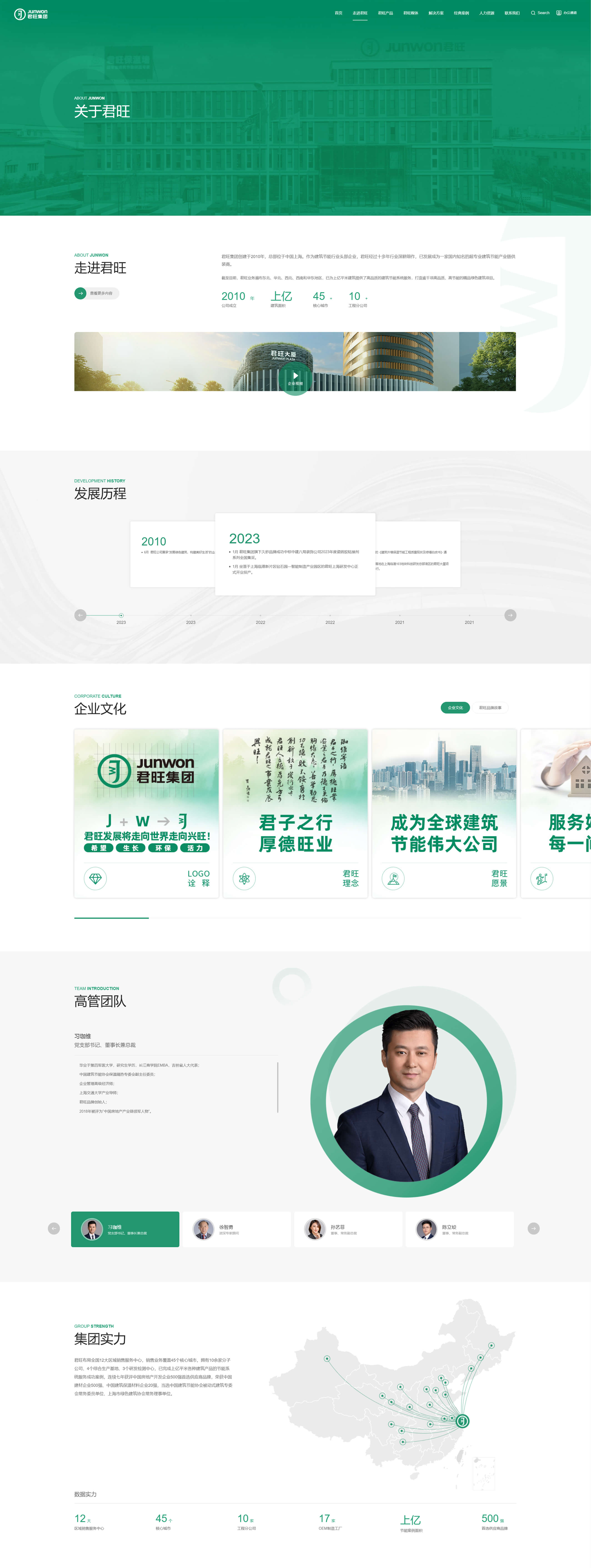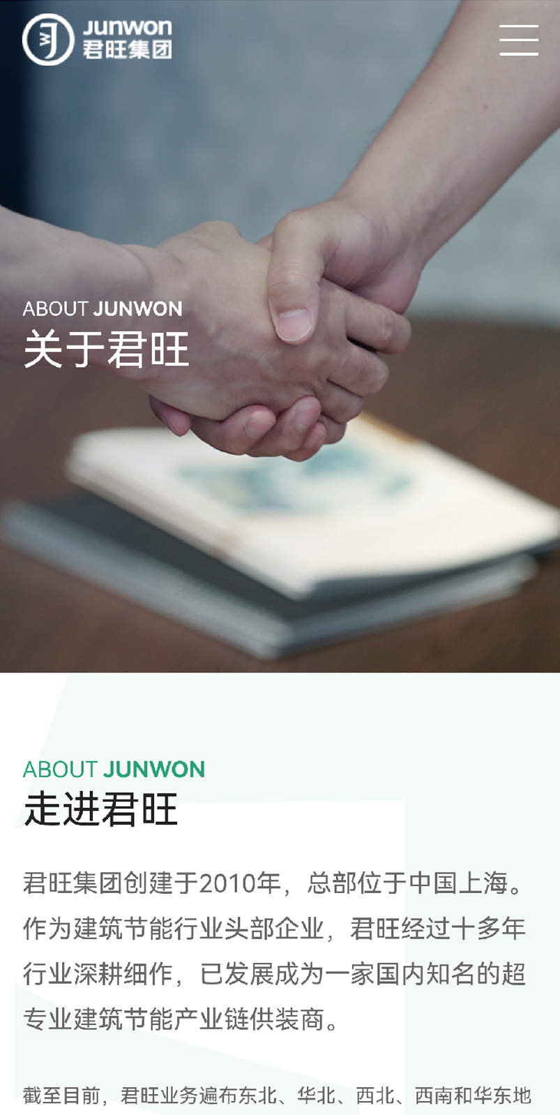 君旺企業官網以深綠色為主調,彰顯其綠色、環保的品牌理念,同時輔以淡藍、黑、白三色,營造清新、專業且層次分明的視覺效果。深綠主色寓意企業對綠色建築的深耕與承諾,淡藍增添清新與未來感,黑色凸顯權威與專業,白色則提升頁麵明亮度與閱讀舒適度。