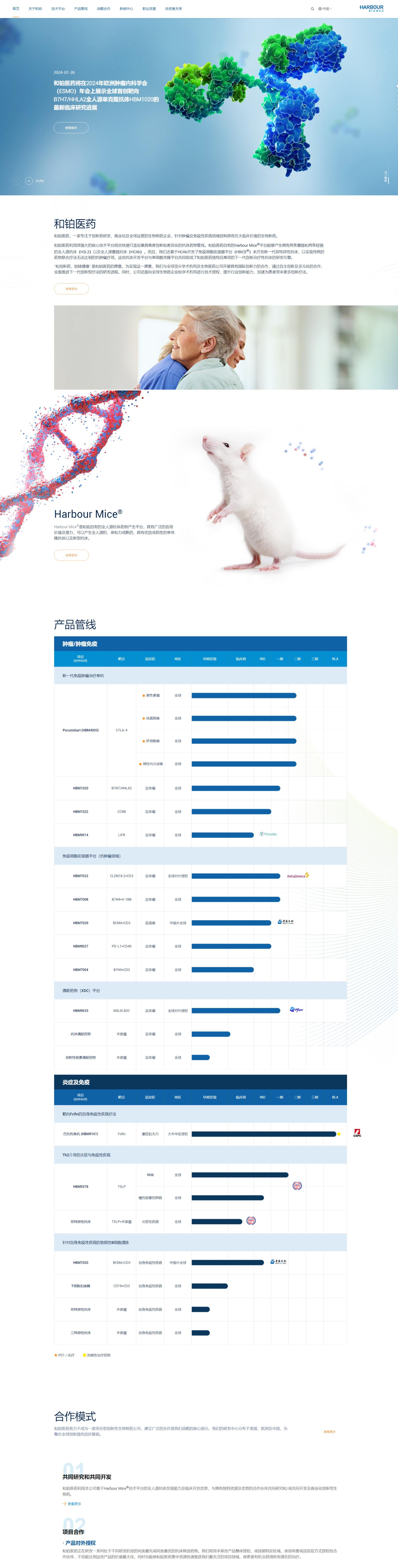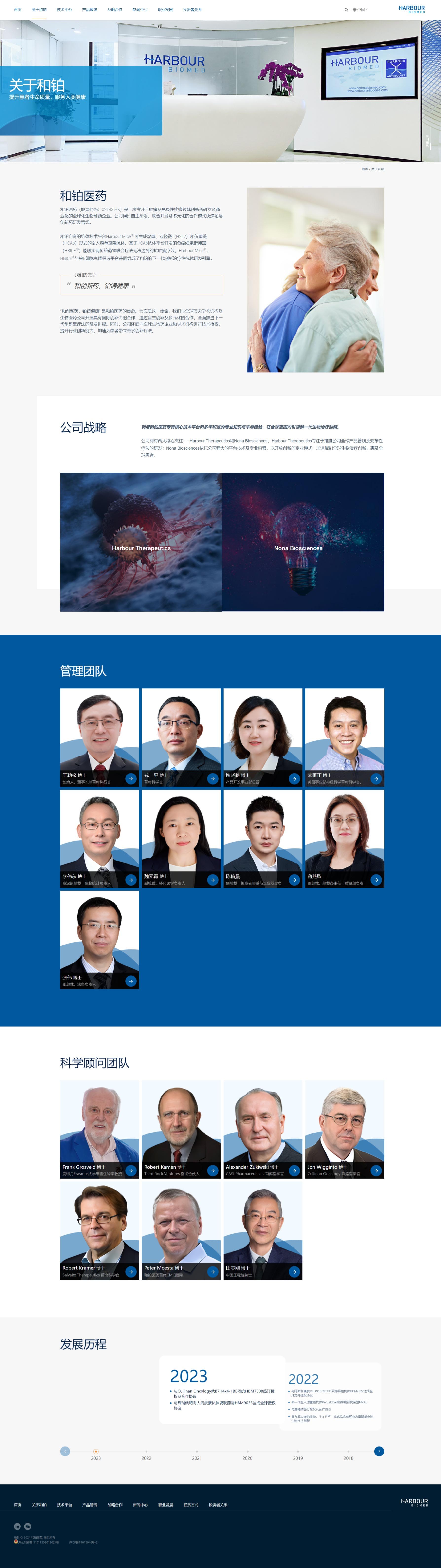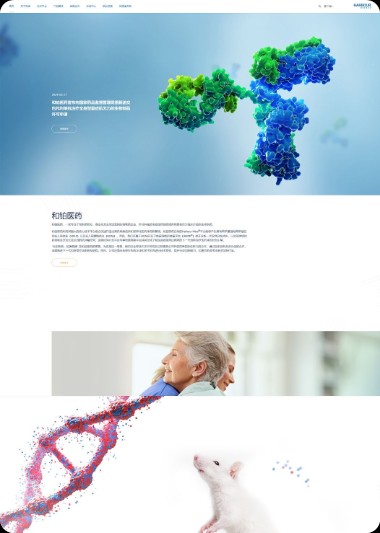 和鉑醫藥網站以藍色作為主色調,搭配白色和灰色等中性色。藍色給人專業、穩重、科技感十足的印象,與和鉑醫藥在生物製藥領域的專業形象相契合,白色主要作為背景色,使整個頁麵顯得幹淨、整潔,為用戶提供了清晰的視覺環境,同時也能夠突出藍色係的主體內容,提高頁麵的可讀性和視覺舒適度。