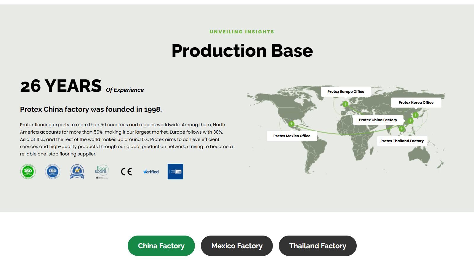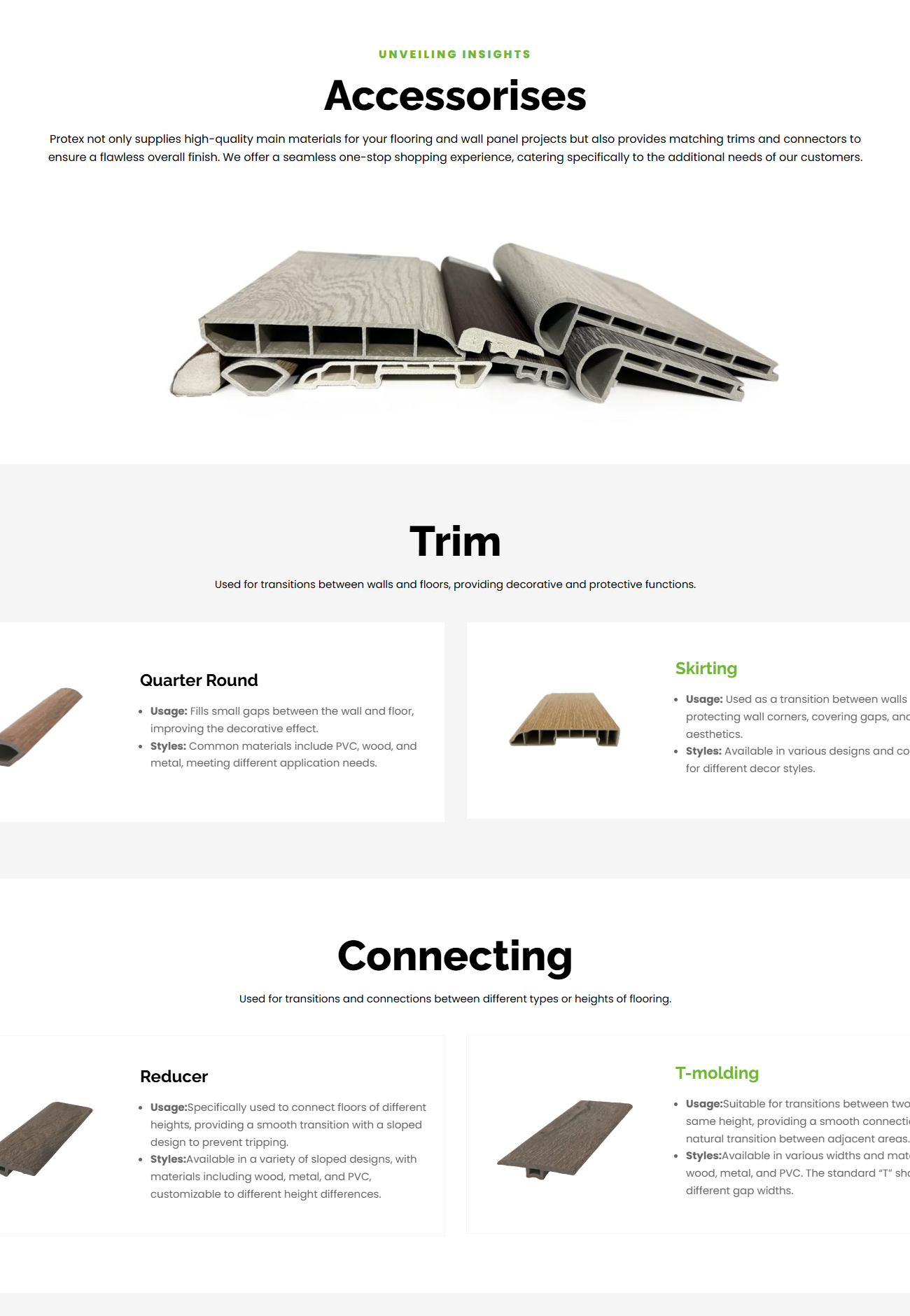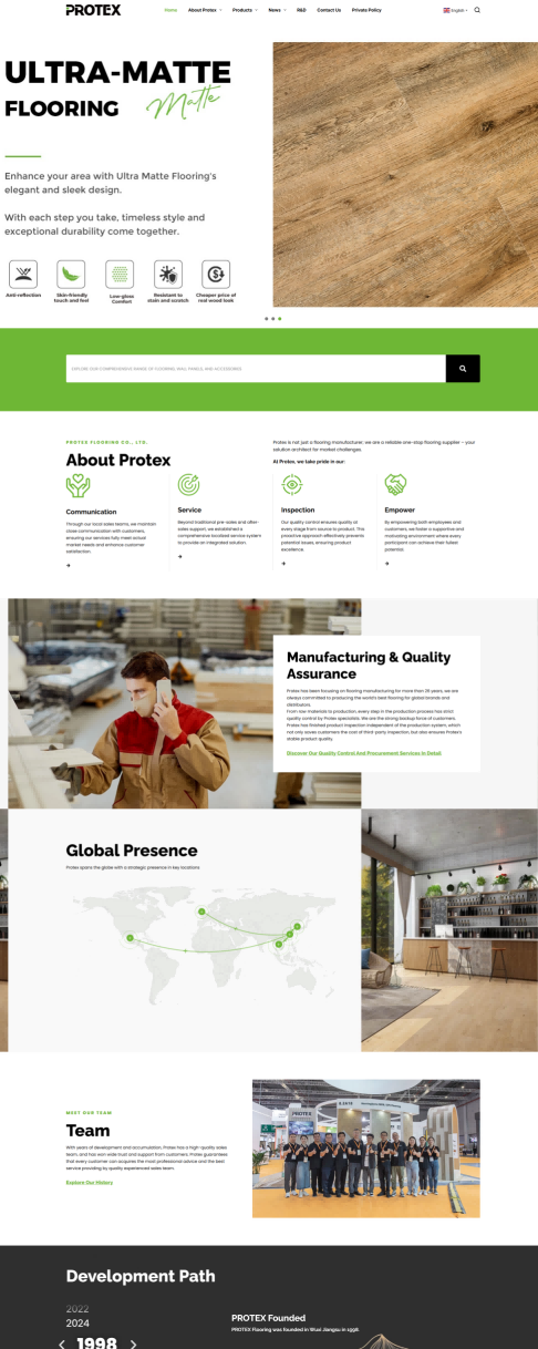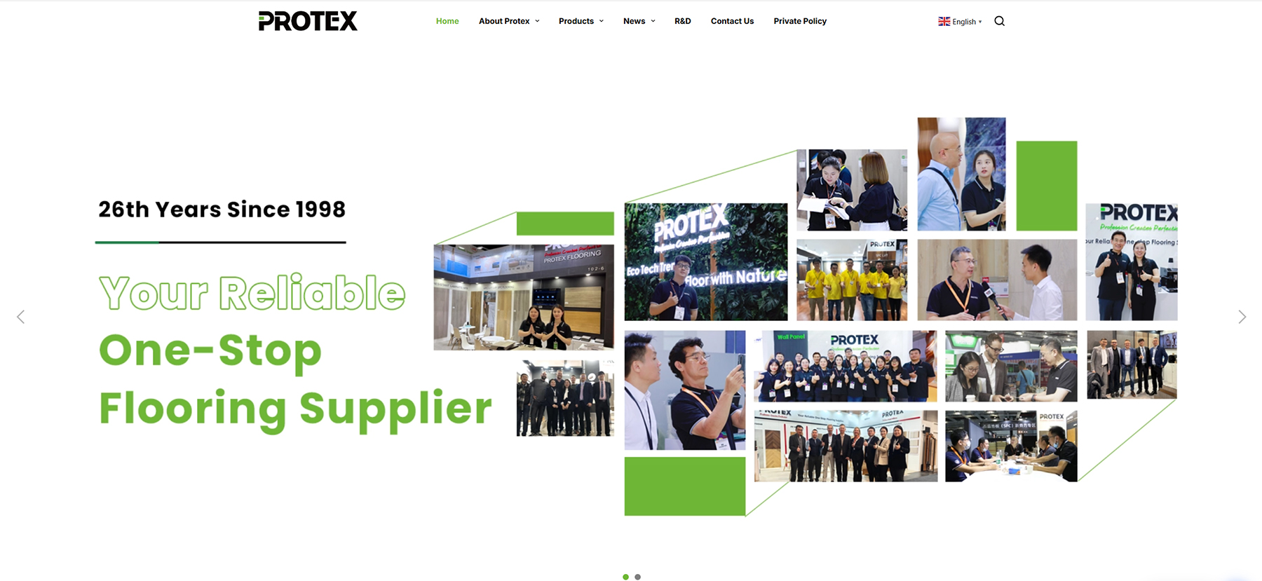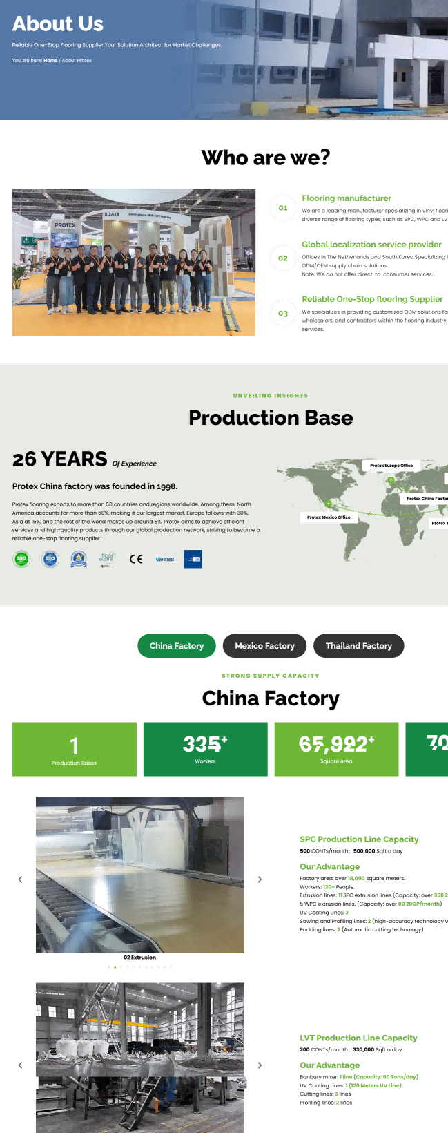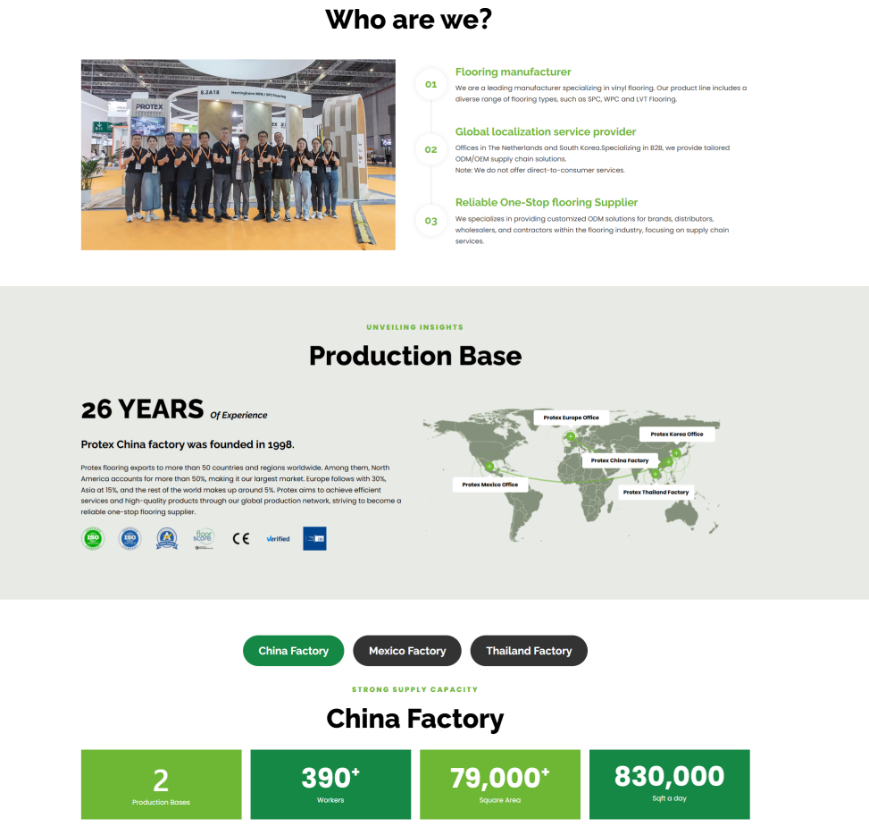 信息清晰:頁麵上方明確標注了公司的聯係方式,包括電話、電子郵件和WhatsApp號碼,方便客戶快速聯係。內容豐富:除了聯係方式外,頁麵還提供了公司的名稱、地址和版權信息,增加了公司的可信度。引導性強:頁麵底部設有“Got questions or ready to kick off your flooring journey with Protex?”的引導語,鼓勵客戶與公司聯係,開始他們的地板選購之旅。