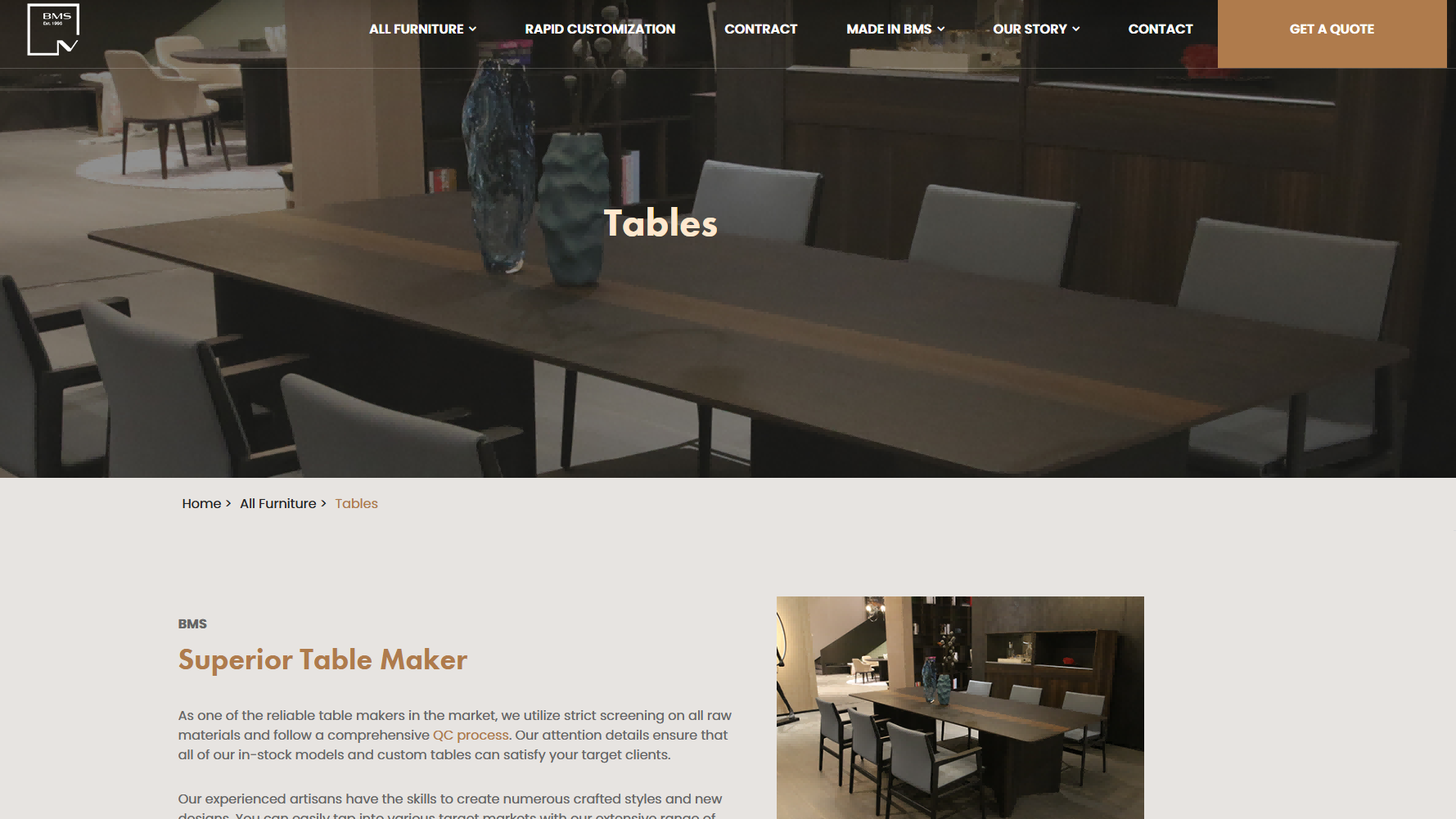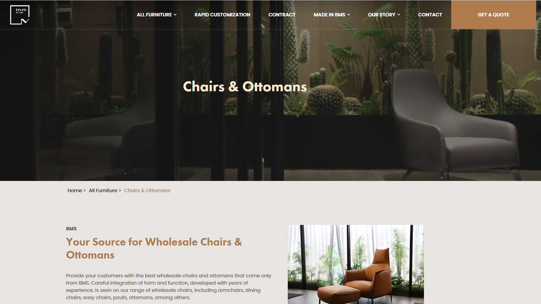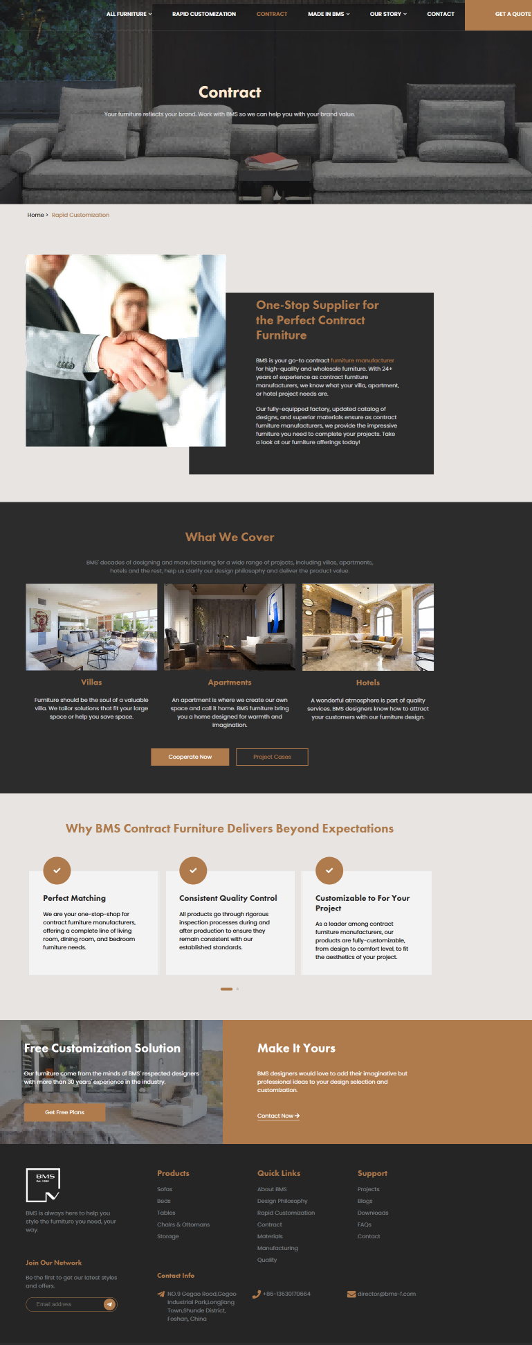 視覺方麵:產品圖片拍攝精美,多角度展示家具的外觀和細節,搭配白色背景,凸顯產品的質感與設計感,塑造了高端、精致的品牌形象。頁麵布局規整,各板塊劃分明確,如產品分類、特色產品、項目案例等,使用戶在瀏覽時能夠快速獲取信息,感受到專業與有序。 交互方麵:在產品展示區域設置了點擊查看詳情的交互功能,方便用戶深入了解產品信息;在頁麵底部設置了 “Join Our Network” 等引導用戶參與的按鈕,促進用戶與公司的進一步聯係。