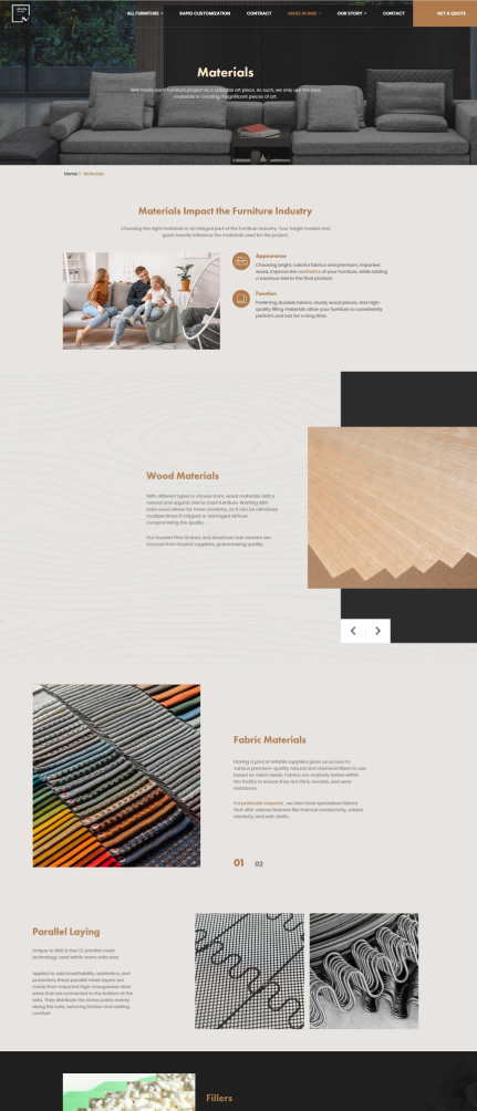 產品分類詳細:在首頁清晰列出了沙發、床、桌椅、儲物等主要家具品類,並進一步細分如布藝沙發、組合沙發、角沙發等,方便用戶快速定位到自己感興趣的產品類型,提高了信息查找的效率。突出品質優勢:詳細介紹了原材料的選用,包括木材、板材、麵料及填充材料等方麵的嚴格篩選過程,增強了用戶對產品質量的信任度。