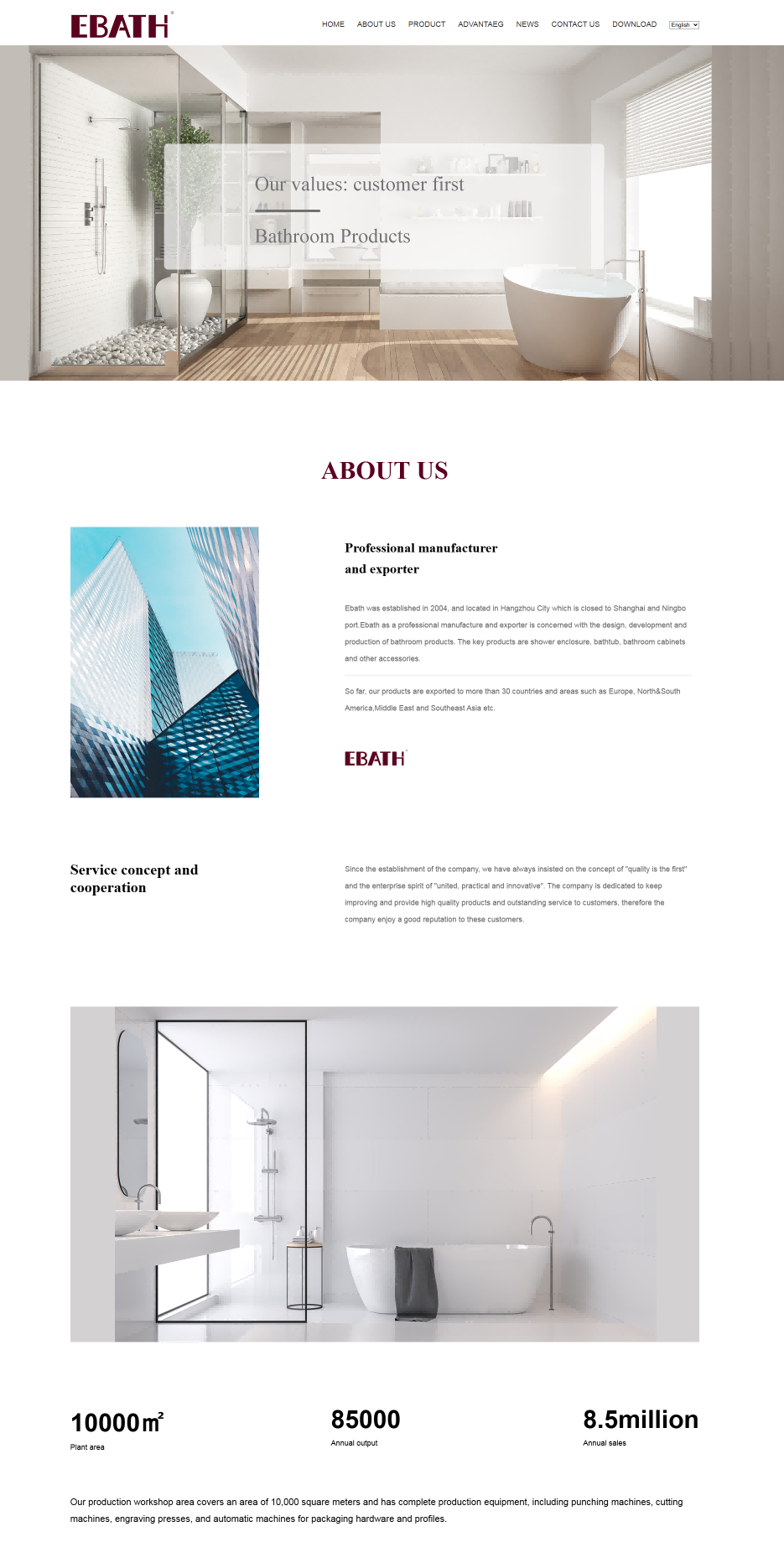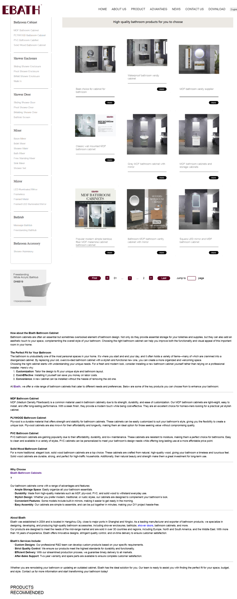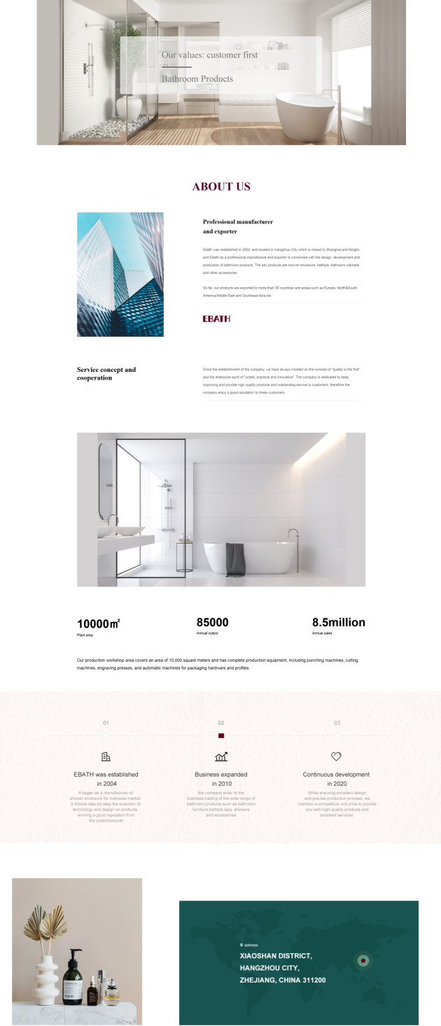 Ebath 的網站旨在展示豐富多樣的衛浴產品線,包括淋浴間、浴缸、浴室櫃等各類產品及配件,吸引全球客戶關注。通過詳細的產品介紹、圖片展示和技術參數說明,為客戶提供全麵的采購信息。同時,突出自身的專業製造能力、優質服務和工廠批發優勢,促進產品銷售,提升品牌在國際衛浴市場的知名度與影響力。