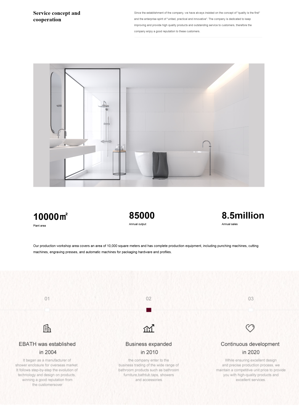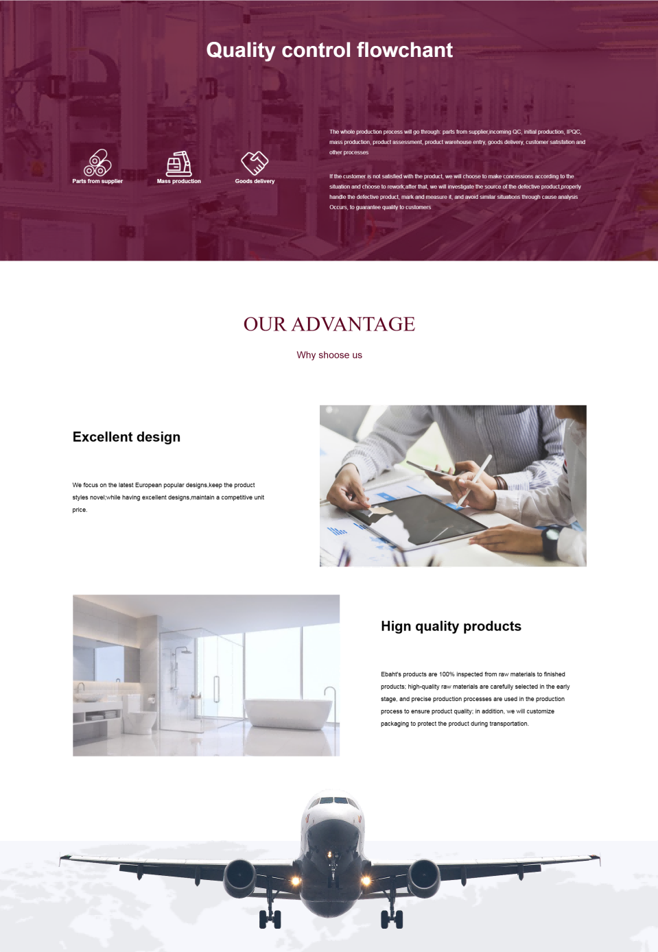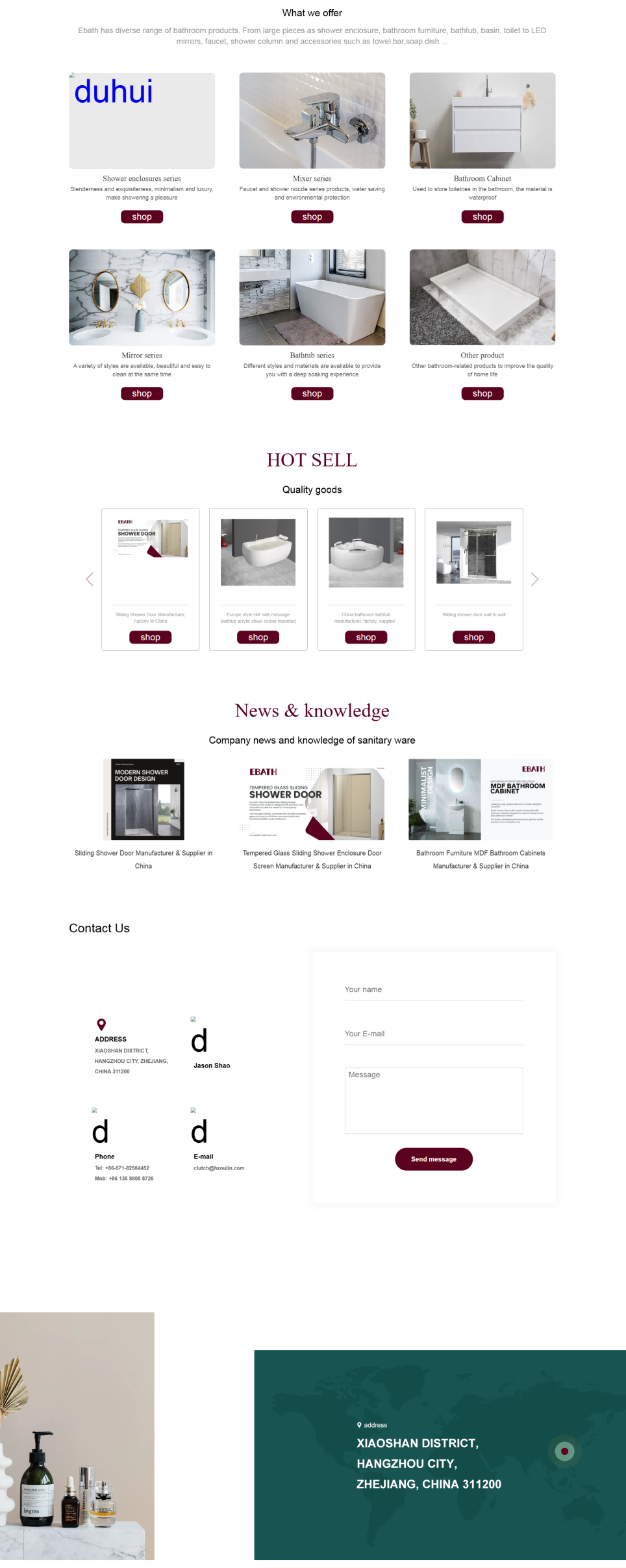Ebath 的網站旨在展示豐富多樣的衛浴產品線,包括淋浴間、浴缸、浴室櫃等各類產品及配件,吸引全球客戶關注。通過詳細的產品介紹、圖片展示和技術參數說明,為客戶提供全麵的采購信息。同時,突出自身的專業製造能力、優質服務和工廠批發優勢,促進產品銷售,提升品牌在國際衛浴市場的知名度與影響力。